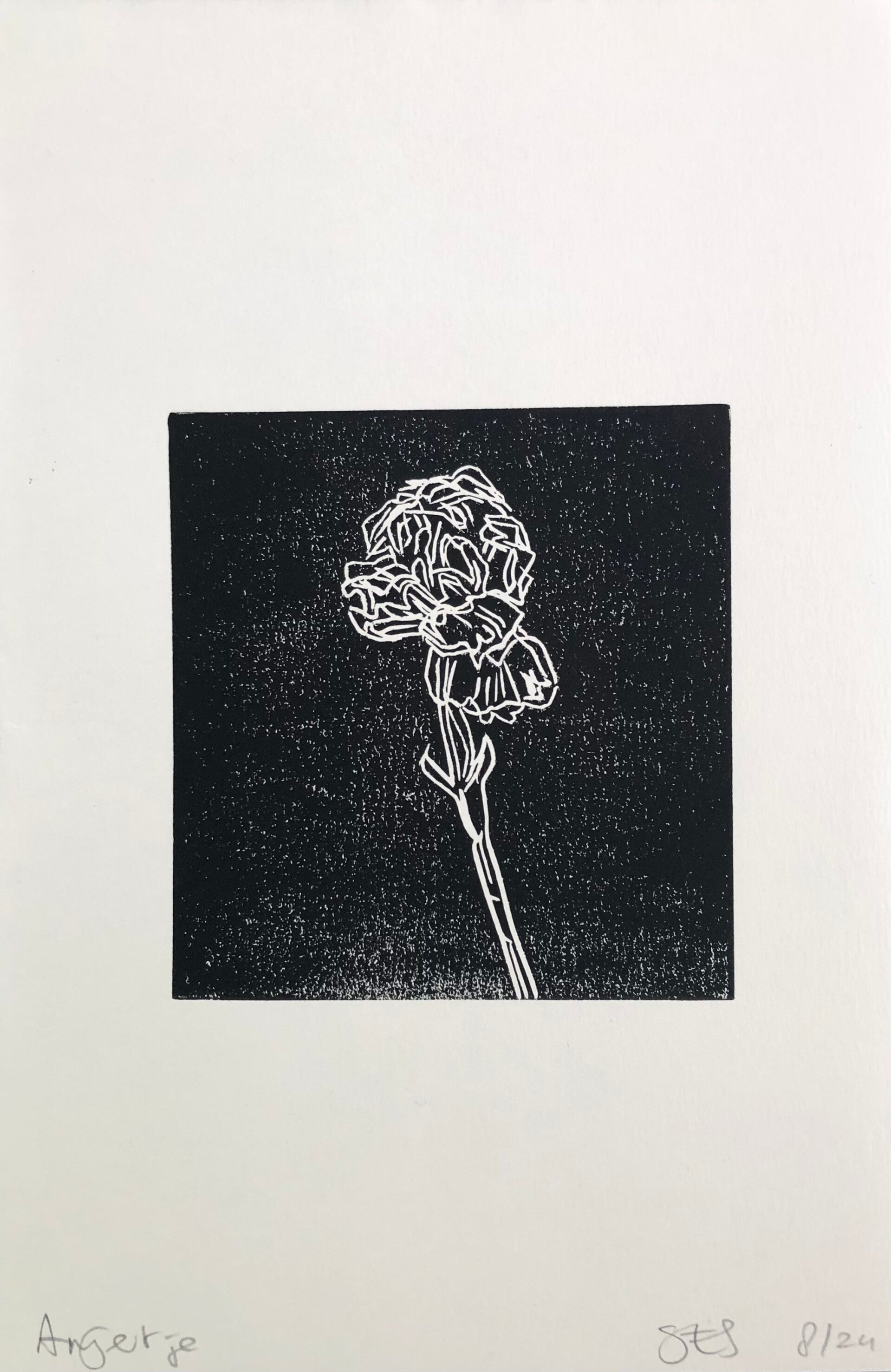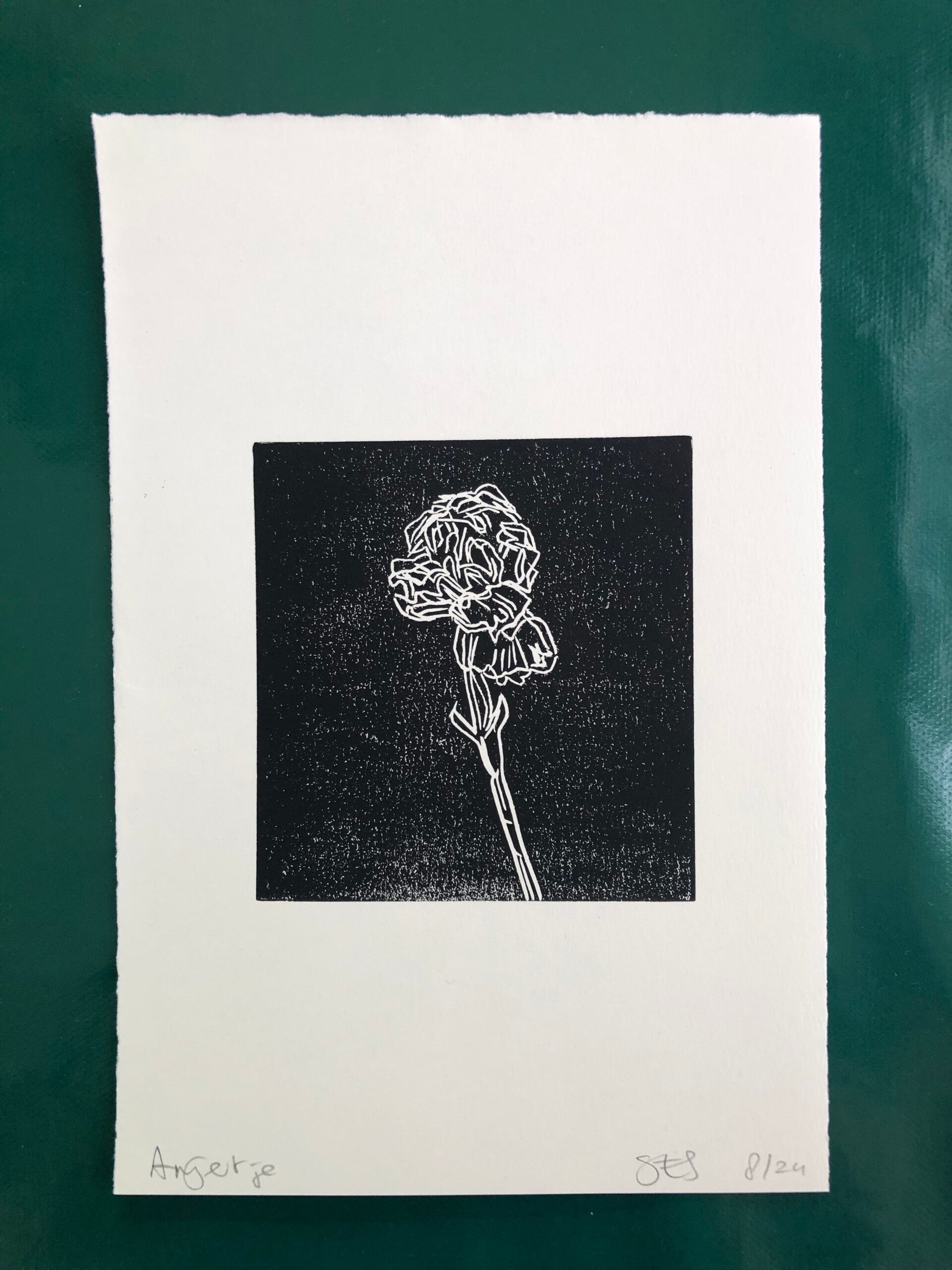 A sweet little thin carved carnation in a tiny square of black ink. I love carnations, especially when the leaves are not quite open yet and you can see the change from spiral into circle.